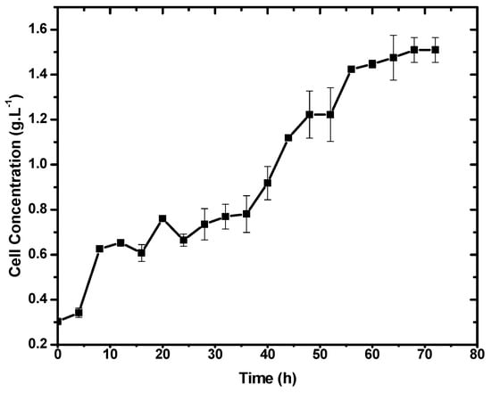Figure 2 shows the cell growth curves obtained for E. durans. Based on the profile of the curves, it can be seen that E. durans has a lag phase of 4 h under the conditions tested, followed by the exponential growth phase. Cell growth is more expressive between 36 and 52 h of fermentation. The specific growth rate for cell mass was calculated between 4 and 56 h of fermentation (µ = 0.4 h−1), corresponding to the exponential phase of growth. After 60 h of fermentation, the cell concentration remained constant, indicating that it had reached the stationary phase.