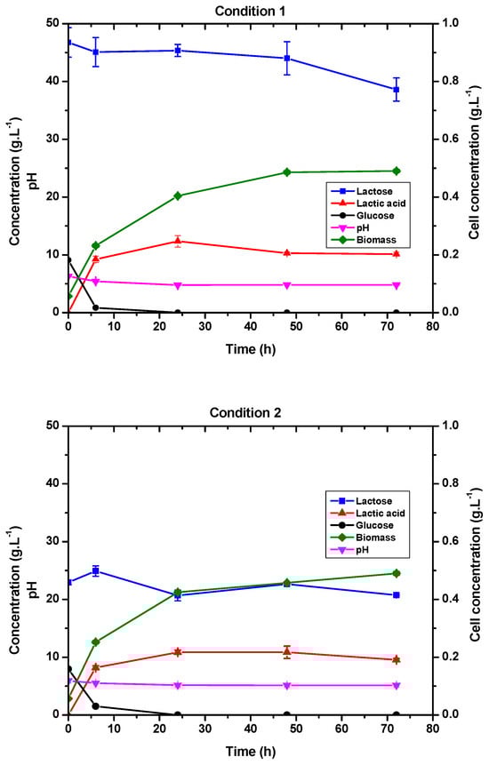 This experiment was carried out under two different conditions to evaluate the influence of the initial substrate concentration on lactic acid production and cell growth. The tested conditions were as follows: Condition 1—40 g·L−1 of lactose and 10 g·L−1 of glucose. Condition 2—20 g·L−1 of lactose and 10 g·L−1 of glucose.