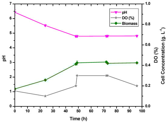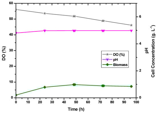 In 50 h of fermentation, the cell concentration increased from 0.17 g·L−1 to 0.41 g·L−1, as shown in Figure 4. Since the agitation rate affects dissolved oxygen levels, gaseous nitrogen was injected throughout the process, and the amount of dissolved oxygen (%DO) was less than 0.3% throughout the whole fermentation. After 50 h of fermentation, the pH of the fermentation medium decreased from 6.43 to 4.80 and stabilized for the next 48 h. Based on the results obtained, it can be said that lactic acid production (Figure 5) is correlated with pH acidification and cell expansion (Figure 4). Furthermore, during the first 20 h of fermentation, lactic acid production caused a drop in pH and an increase in DO.