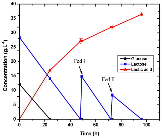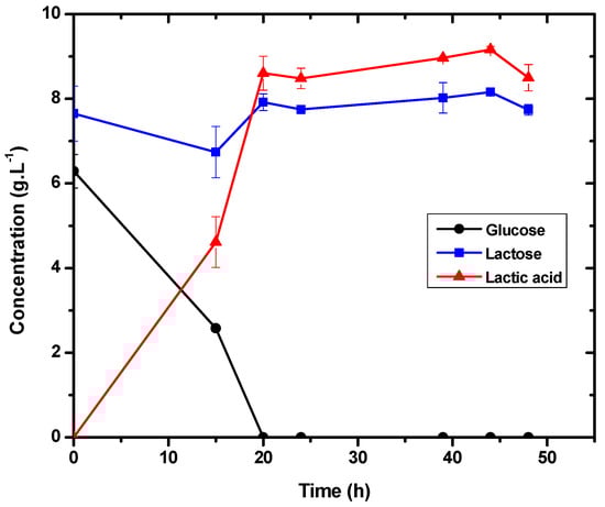 In both conditions, glucose was practically all consumed in the first 6 h of fermentation, as shown in Figure 3. We chose to adjust the lactose concentration because, although glucose is the strain’s preferred substrate, its consumption would allow agro-industrial waste to be used as a carbon source for lactic acid production [29,30,31].
