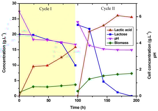 In order to evaluate the performance of adapted cells, a batch was performed using cell recycling. In this experiment, it was noticed that experiments with adapted cells produced more lactic acid in successive batch cycles. The remaining cells from the first fermentation (cycle I) were used as inoculum for the second batch (cycle II) in this experiment. Fermentations were carried out with 10 g·L−1 of glucose and 20 g·L−1 of lactose, with a cell concentration of 0.28 g·L−1 for the first fermentation and 0.37 g·L−1 for the second. The bacteria cells grown in the first fermentation were used as the inoculum for the second fermentation, which was carried out in a medium containing 20 g·L−1 of lactose as the sole carbon source.