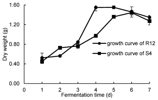 Growth curves were measured using the mycelium dry weight method. The growth curves of R12 and S4 are shown in Figure 1. It can be seen that the mycelium dry weight of R12 did not change much over the first two days. On the third day, the mycelium dry weight increased rapidly. After the fourth day, the mycelium dry weight reached its maximum value and remained stable, so it was determined that R12 entered the rapid growth phase on the fourth day. According to the growth curve of S4, it was found that over days 1–4, the strain grew slowly, and the dry weight changed little. After the fifth day, the mycelium dry weight reached its maximum value and remained stable, so it was determined that S4 entered the rapid growth stage on the fifth day. Therefore, for the experiment, we selected R12 and S4 cultured for 4 and 5 days, respectively, as the fermentation seed liquids.