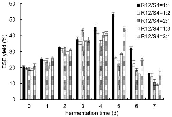 The ESE yields from R. ternate from the fermentation of two endophytic fungi (R12 and S4) are shown in Figure 3. The yields of the ESE of R. ternate increased with an increase in the fermentation time with different addition ratios. They generally reached their maximum values on the fourth or fifth day and gradually decreased on the sixth and seventh days. When R12/S4 = 1:1, the maximum ESE yield was 53.52% on the fifth day. Therefore, compared with the single fermentation, it was found that mixed fermentation could effectively increase the content of the ESE of R. ternate.