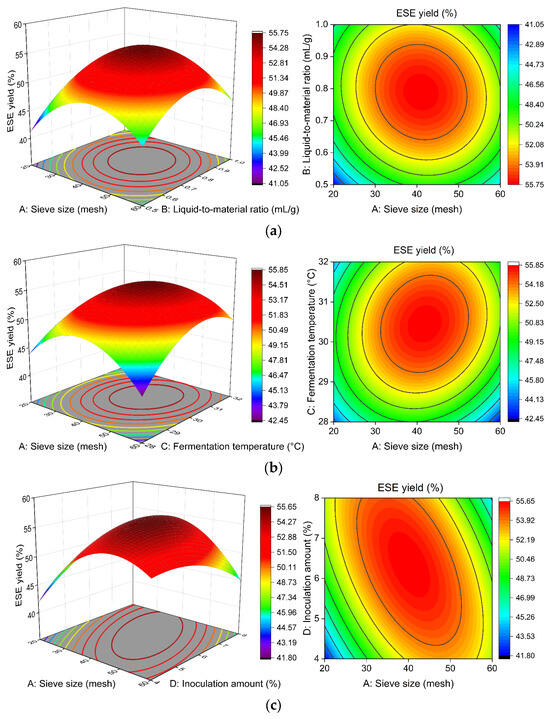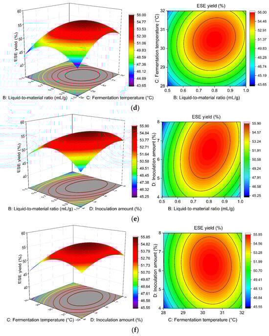 According to the variance analysis of the model (Table 3), the B (liquid-to-material ratio) and C (fermentation temperature) in the primary term had an extremely significant impact on the response value (p < 0.01), the AD (sieve size number and inoculation amount) in the interaction term had an extremely significant impact on the response value (p < 0.01), the BD (liquid-to-material ratio and inoculation amount) in the interaction term had a significant impact on the response value (p < 0.05), and the other terms were not significant (p > 0.05). In the square term, A2, B2, C2, and D2 all had significant effects on the response value (p < 0.01). The fitting model obtained from the experimental data had an F-value of F = 14.74 (p < 0.0001), indicating that the model fit the data well. The misfit term (p = 0.1204 > 0.05) indicated that the misfit was not significant, and the experimental value was in good agreement with the predicted value. The correlation coefficient (R2 = 0.9365), the adjusted determination coefficient ( = 0.8729), and the coefficient of variation (C.V. = 3.48%) of the model indicated that the linear relationship between the independent variables and the response values of the model was significant and appropriate to predict the ESE yield of R. ternate under different fermentation conditions.