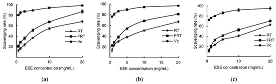 Changes in scavenging rate of DPPH free radicals (a), ABTS+ free radicals (b), and hydroxyl free radicals (c) before and after fermentation. ESE: ethanol-soluble extract; RT: R. ternate; FRT: unfermented R. ternate; VC: ascorbic acid; DPPH: 2,2-Diphenyl-1-Picrylhydrazyl; ABTS+: 2,2′-Azinobis-(3-ethylbenzthiazoline-6-sulphonate).
