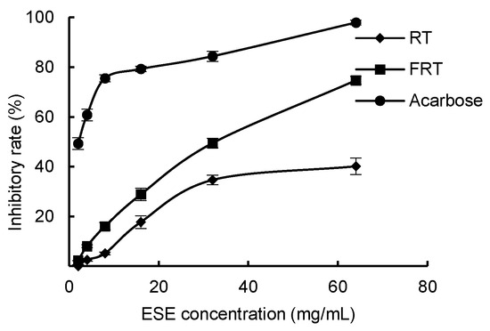 Changes in inhibition rate of α-amylase before and after fermentation. ESE: ethanol-soluble extract; RT: R. ternate; FRT: unfermented R. ternate.