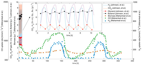 Mahamkali et al. observed metabolic oscillation in continuous culture of C. autoethanogenum in gas uptake rate, extracellular by-products (acetate, ethanol, 2,3-butanediol, pyruvate) and biomass levels [33] during gas fermentation using syngas (CO, H2, CO2). The oscillation was characterized by changes in substrate consumption, with oscillations in the CO and H2 uptake rates. Initially, the organism grows on CO and then switches to co-utilizing CO and H2 (see Figure 1). It lasts until the thermodynamic driving force for the production of ethanol through the oxidoreductase (AOR) is exhausted due to ethanol accumulation, and the culture crashes (the growth rate falls under the dilution rate). H2 uptake as well as growth decline, and an increase in CO concentration causes a shift to growth on CO, which cannot support the culture by itself, and the cells keep declining until they hit the point for which the provided CO is supportive. The oscillation was not linked to translational control, but a coordination with the cell-internal redox potential was shown. The observed period of oscillation was about 6 days.