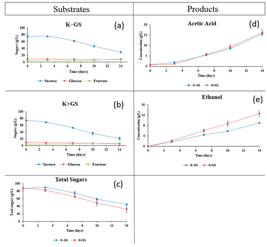 Kinetics of hydrolysis and sugar consumption (a–c), acetic acid (d) production, and ethanol (e) production during 14 days of kombucha fermentation without galvanized steel (K−GS) and with galvanized steel coupon (K+GS). All data represent average values from duplicate analyses.