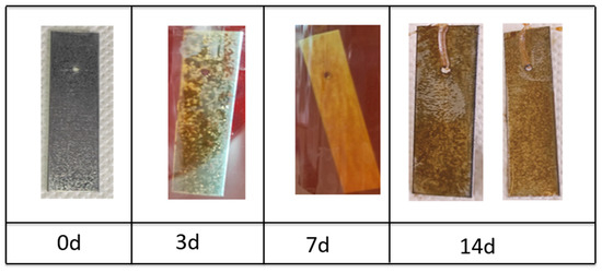 Evolution of galvanized steel coupons immersed in the kombucha medium during 14 days of incubation (d: time in days).