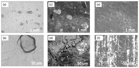 SEM images of galvanized steel coupons (a,b) before and, (c,d) after 14-day incubation and (e,f) after removing corrosion products.