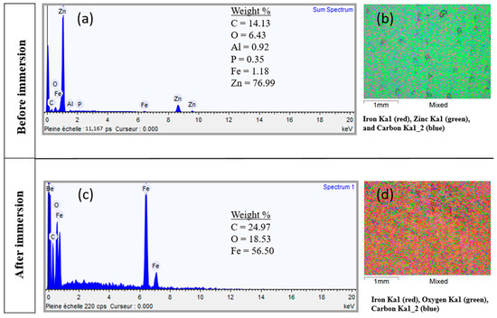 EDS analysis of corrosion products formed on galvanized steel coupons immersed in kombucha medium for 14 days: Spectra (a) before and (c) after the immersion test. Element mapping images (b) before and (d) after the immersion test.