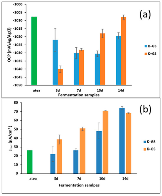 Stable open circuit potential (OCP) (a) at one hour and corrosion current density (Jcorr) data (b) derived from the potentiodynamic polarization curves in various solutions of Kombucha (K−GS) without and (K+GS) with galvanized steel coupon at 3, 7, 10, and 14 days of fermentation. Acidified black tea (atea) was used to represent the initial stage.
