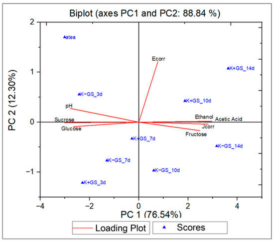 Principal component analysis (PCA) was performed to explore the correlations among sugar consumption, metabolite production, and corrosion current density in unfermented (atea) and fermented black tea without (K−GS) and with (K+GS) galvanized steel coupons over a 14-day incubation period. The PCA loading plot (Figure S4a in Supplementary Materials) visually represents the relationships between sucrose, glucose, fructose, acetic acid, ethanol, pH, corrosion potential Ecorr, corrosion current density Jcorr, and the principal components extracted from the data. The first two principal components, PC1 and PC2, explained 88.84 percent of the total variance, accounting for 76.54% and 12.30% of variability, respectively. Based on the PCA biplot results (Figure 6) and Table S2 (Supplementary Materials), both positive and negative correlations were observed. Fructose, acetic acid, ethanol, and Jcorr were associated with positive PC1 values and made significant contributions to the variance explained by this axis, with loadings of 0.331, 0.397, 0.393, and 0.377, respectively. Sample K+GS_10d (after 10 days of fermentation in the presence of galvanized steel) exhibited higher ethanol and acetic acid content, indicating a strong positive correlation, as did K−GS_14d, which had a higher fructose content. In contrast, the sample after 3 days of fermentation, K−GS_3d, displayed negative PC1 components and showed higher pH, sucrose, and glucose contents. These findings highlighted significant correlations between the studied variables. Specifically, sugar consumption was positively correlated with metabolite production (acetic acid and ethanol), suggesting that higher sugar consumption leads to increased production of metabolites, which are also influenced by the presence of galvanized steel during the fermentation process. Based on the correlation matrix in Table 3, acetic acid exhibited a positive correlation with fructose, ethanol, and Jcorr (0.840, 0.974, and 0.866, respectively) and a negative correlation with sucrose (−0.972), indicating that sucrose was assimilated by the microorganisms for the production of ethanol and organic acid, leading to metal corrosion (more important Jcorr). In addition, pH showed a negative correlation with acetic acid (−0.922), which are inversely proportional to each other.