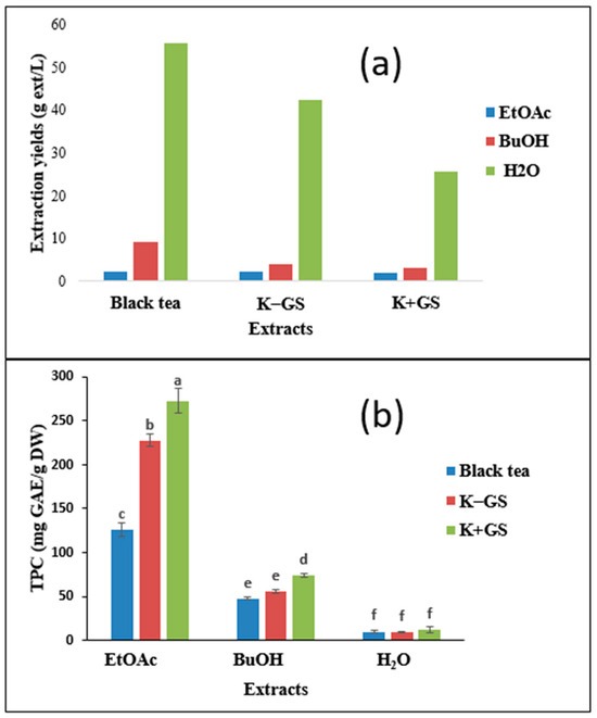 Extraction yields (a) of different solvents (EtOAc: ethyl acetate, BuOH: butanol) and residual aqueous phases (H2O) from the black tea and kombucha medium (without K−GS and with K+GS galvanized steel), along with total phenolic content (TPC) of dry extracts (b); extracts were tested at 50 mg/L. Means values ± SD (n = 3); Different letters indicate significant differences (p ≤ 0.05).