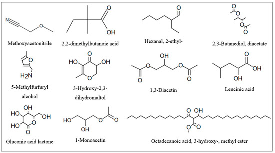 The volatile compounds detected in unfermented and fermented (K−GS, K+GS) black tea are summarized in Table 5 and Table 6. Analyses with GC-MS allowed the identification of 53 compounds before and after derivatization, including several polyphenols, organic acids, sugars, ketones, esters, and alcohols. About 26% of the compounds were found in all samples (ethyl 2-methylbutanoate, o-xylene, 3-methyl-4-heptanone, butyl isobutanoate, butyl butanoate, undecane, dihydroisophorone, 2,4-ditert-butylphenol, methyl hexadecanoate, caffeine, lactic acid, glycerol, gallic acid, and palmitic acid). The largest surface proportions of these compounds were abundant in K+GS. Notably, such compounds were produced 2-fold higher in K+GS compared to K−GS, including 3-methyl-4-heptanone, butyl isobutanoate, and butyl butanoate. Lactic acid and gallic acid also showed higher surface areas (64.67 × 108 and 242.83 × 108 in EtOAc extracts, respectively) in the presence of GS compared to classical fermentation (43.74 × 108 and 189.32 × 108, respectively). The remarkable difference between the two kombucha samples is consistent with the improvement in fermentation kinetics in the presence of galvanized steel. A total of 15 compounds were identified only in K+GS (including 2-furanmethanol, methoxyacetonitrile, 2,2-dimethylbutanoic acid, hexanal, 2-ethyl-, 2,3-butanediol,diacetate, 5-methylfurfuryl alcohol, octadecanoic acid,3-hydroxy-, methyl ester, 1,3-diacetin, 3-Hydroxy-2,3-dihydromaltol, leucinic acid, dihydroxyacetone, 1-monoacetin, gluconic acid lactone, 2,3,4,5,6-pentahydroxyhexanal, and catechin). All of these compounds were identified for the first time (Figure 8), except for 2-furanmethanol, dihydroxyacetone, and catechin. According to the literature, 2-furanmethanol was previously detected in black tea [35]. In addition, dihydroxyacetone was identified in fermented black tea as a metabolite of acetic acid bacteria using sugar alcohols such as glycerol [36,37]. Other studies reported the presence of catechin as a constituent of black tea [21] and kombucha products [36]. The most abundant volatile compounds were detected in the ethyl acetate extracts, which had the highest total phenolic contents.