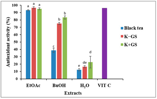 Antioxidant activity of black tea and kombucha extracts (EtOAc: ethyl acetate; BuOH: butanol; H2O: aqueous phase, VIT C: ascorbic acid). Means values ± SD (n = 3); Different letters indicate significant differences (p ≤ 0.05).