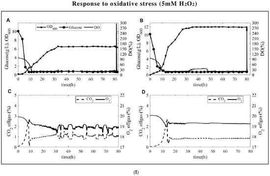 Glucose-limited chemostats were carried out at a dilution rate of 0.1 h−1 for both yeasts. The time profiles from the start of the batch until the steady state is reached are presented in Figure 1. Both yeasts have fairly stable glucose, biomass, and DO profiles. At the end of the batch phase (around the 10th hour), the CO2 level reaches around 4%, the feeding starts, and the CO2 level quickly decreases after feeding. Upon stress application, the DO levels instantaneously increase up to 300 % for H2O2 perturbation (Figure 1I) and up to 60% for DTT perturbation (Figure 1II), with the latter being attributed to the interaction of DTT with air and trace metals in the medium producing H2O2 [25]. As for the microbial physiology, due to the respiro-fermentative characteristics of S. cerevisiae, the yield of biomass on glucose is lower than the yield of biomass on glucose of P. pastoris in the batch fermentations. While P. pastoris was reported to be Crabtree-negative in earlier publications [19], low levels of ethanol were measured in our batch experiments in the presence of excess glucose in line with the recent literature [20,21] although the levels are far less than what was measured for S. cerevisiae (3–4 g/L vs. 0.5–1.5 g/L ethanol for S. cerevisiae and P. pastoris, respectively). Additionally, S. cerevisiae produces 0.3–0.5 g/L glycerol and acetate during the batch culture, while there is no detectable by-product formation carried out by P. pastoris. The biomass-specific uptake and secretion rates, as well as carbon and the degrees of reduction recoveries at a steady state, were presented in Table 1.