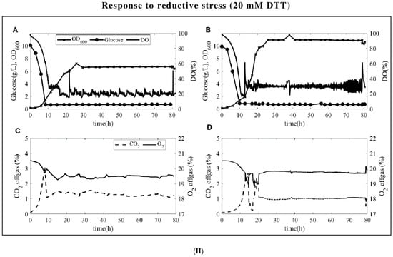 (I). Glucose, biomass, and dissolved oxygen levels (DO(%)) observed for oxidative stresses (top panel (I)) and reductive (bottom panel (II)) stresses. (A) S. cerevisiae, (B) P. pastoris, off-gas measurements of (C) S. cerevisiae, and (D) P. pastoris during chemostat cultures are in each panel. The feeding started right around the CO2 peak, which was around the 9th hour for S. cerevisiae and around the 12th hour for P. pastoris.