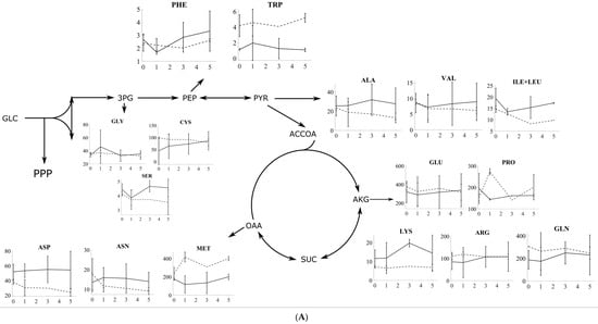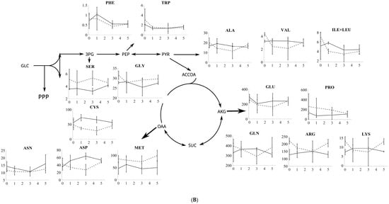 Several precursors to amino acids have been quantified by Christodolou et al. [28]. Our work and their work can be seen as complementary since a number of precursor metabolites to amino acids have already been reported by them. Two of these are striking as follows: pyruvate and α-ketoglutarate (α-KG). For pyruvate, the levels decrease in the first two minutes before restoring back afterwards. In our work, the amino acids from pyruvate (PYR), namely valine and ile+leu, also decrease initially before restoring back after the first minute. This correlated profile points (closely) to the mass action kinetics for the corresponding biochemical reactions. Similarly, for α-KG, its level is measured as decreasing immediately after stress, as reported by Christodolou et al. [28], and the amino acids of glutamate and proline also follow a similar trend, thereby indicating clearly linear kinetics for these synthesis reactions. Lastly, 3-phosphoglycerate (3-PG) only correlates with serine among 3-PG-derived amino acids.