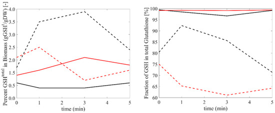 The change in the biomass of total glutathione (left panel) as well as the fraction of the reduced form (GSH) (right panel) as a function of reductive (red) and oxidative (black) stresses for both yeasts (S. cerevisiae, dashed lines; P. pastoris, solid lines).
