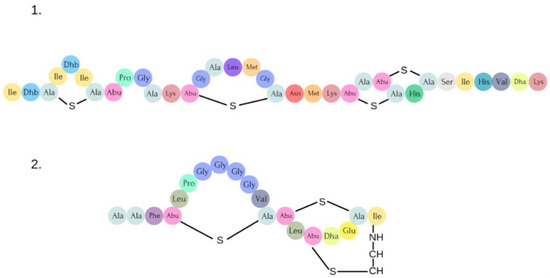 Class I: Known as antibiotics, these are thermo-stable peptides consisting of 19 to 50 amino acids (Figure 3). They incorporate polycyclic amino acids characteristic of thioethers, such as lanthionine, methyl-lanthionine, dehydroalanine, and 2-amino isobutyric acid [31]. Based on their charge, this class is further subdivided into two types. Type A sub-group molecules are helical in shape, flexible, and have a positive charge, with a molecular weight ranging from 2 to 4 kDa. These peptides induce the creation of pores in the cell membrane of unwanted microorganisms, leading to depolarization of the cytoplasmic membrane. Type B antibiotics are peptides with a molecular weight of 2–3 kDa and exhibit either a lack of net charge or a negative net charge. These are globular molecules that directly interfere with cellular enzymatic reactions, affecting, for example, cell wall synthesis. Their action targets crucial processes in cellular functioning, influencing the cell’s biochemical machinery specifically [31].