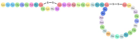 Class II: Bacteriocins of class II are smaller thermo-stable peptides with a molecular weight less than 10 kDa. They have an amphiphilic helical structure, allowing them to insert into the cell membrane of the pathogenic microorganism, inducing depolarization and, consequently, cell death. This class is further subdivided into three types: Type A bacteriocins are characterized as monomers and present a consensus sequence at the N-terminal end comprising Tyr-Gly-Asn-Gly-Val-Xaa-Cys. Type B includes two-component bacteriocins, as their antimicrobial activity is generated by two different peptides present in their structure, which collaborate synergistically. Type C bacteriocins encompass circular bacteriocins (Figure 4), which have two transmembrane segments facilitating pore formation in the target cell [31].