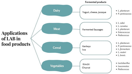 LAB play a prominent role in the food industry, actively participating in the production of fermented foods and beverages, such as cereals-based beers, dairy products, and cheeses, among others (Figure 6). For millennia, LAB fermentation occurred spontaneously, harnessing microorganisms naturally present in the food microbiota. While these traditional techniques persist, technological advancements and evolving dietary demands have driven the adoption of processes that enhance the control, standardization, and organoleptic characteristics of foods. The introduction of fermentation starter cultures has facilitated the industrialization of these production methods [48].