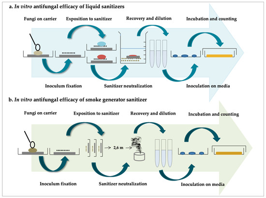 Schematic of in vitro efficacy testing for liquid (a) and smoke (b) sanitizers.