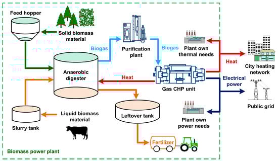 Biomass energy consumption is expected to increase in both final energy consumption and electricity generation. The additional consumption of energy from biomass requires an increase in the amount of biomass in Bulgaria, which will increase by 37% in the period 2020–2030 [16]. Rational solutions for the optimal use of plant and animal waste are increasingly sought to reduce the harmful impact on the environment and increase the share of the use of renewable energy sources in the final energy consumption. In most cases, by means of known fermentation technologies, the aim is to produce combustible gas (biogas), which could be used for the combined production of electrical and thermal energy.
