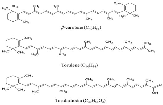 Torulene (C40H54) and torularhodin (C40H52O2) are two main carotenoids often found in red yeasts. Torulene contains a β-ionone ring attached to a polyene chain and has 13 double bonds, which gives it more potent antioxidant properties than β-carotene [18] (Figure 1). Torularhodin is more oxidative than torulene due to hydroxylation and oxidation. This molecule acts as a potent antioxidant, stabilizing cell membranes under stressful conditions. Torularhodin is more effective than β-carotene and torulene at quenching singlet oxygen. Furthermore, it can eliminate free radicals and inhibit the formation of lipid peroxides, which contributes to cell protection, including resistance to tumors [19]. Like lycopene, torulene and torularhodin have caused tumor cells to undergo apoptosis, inhibiting prostate cancer development, in anticancer tests [20]. Both substances exhibit anti-inflammatory [21,22] qualities. These two carotenoids’ antibacterial properties have made them helpful in preventing infections, especially in goods, implants, and medicinal preparations that call for natural antimicrobials [23].