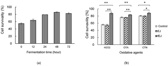 In order to determine optimum EJ fermentation conditions, MSC-5T strain was fermented for 12, 24, 48, and 72 h. The bacterial growth increased with the increasing fermentation time at 28 °C and reached its stationary phase with the maximum cell population (8.69 log CFU/mL) at 48h fermentation. The data presented in Figure 1 show that the MSC-5T-fermented extract significantly increased the cell survivability of HEK293 cells. As described in Figure 1a, the survival rate of HEK293 cells pretreated with 1% of fermented EJ extract (fEJ) increased significantly from 54.6% (0 h of fermentation) to 85.6% (48 h of fermentation), while dropping slightly to 82.4% with 72 h of fermentation, against H2O2-induced oxidative damage. Thus, 48 h was the best fermentation time for the MSC-5T strain. As can be observed in Figure 1b, exposure to 0.3 mM H2O2 produced a significant decrease in cell viability of 55.9% in HEK293 cells, while exposure to fungal toxin OTA (5 μM) and CTN (75 μM) resulted in 76.3% and 80.4% viabilities, respectively. Similar effects have been obtained in the presence of unfermented EJ.