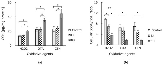 Hepatic GSH, a ubiquitous intracellular peptide, is an important non-enzymatic antioxidant that protects cells against oxidative injury by scavenging ROS and maintaining enzymatic antioxidants. When cells are damaged by oxidation, GSH participates in the antioxidant reaction to be oxidized to GSSG, resulting in an increase in the ratio of GSSG/GSH. As regards the evaluation of glutathione homeostasis (Figure 2a), it can be clearly seen that the pretreatment of HEK293 cells with fermented EJ extract greatly increased GSH levels, while unfermented extract did not affect the cellular GSH content. Accordingly, concentrations of GSH enzyme levels with the pretreatment of fermented EJ were 20.1 µg/mg in H2O2, 35.2 µg/mg in OTA, and 44.4 µg/mg in CTN—values that are statistically significant (p < 0.01).