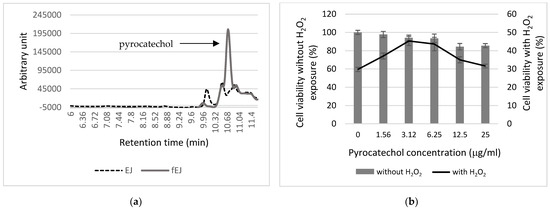 HPLC chromatogram and pyrocatechol profiling at H2O2-induced HEK293 cells. (a) HPLC chromatogram of EJ extract without or with MSC-5T fermentation. (b) Relative cell viability of HEK293 cells treated without (bar) or with H2O2 (line) in the presence of pyrocatechol at 1.56, 3.12, 6.25, 12.5, and 25 µg/mL. Error bars represent +/− standard deviation.