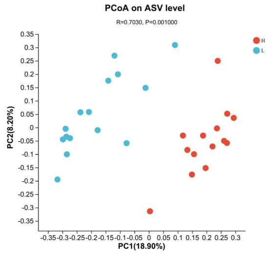 From the principal coordinates analysis (PCoA) plot, there was a significant deviation (R = 0.7030, p = 0.001) between the confidence ellipses of the bacterial communities during the fattening (H) and growth (L) periods. This marked deviation signifies a significant change in the bacterial community during the late fattening period compared to the growth period, as depicted in Figure 1.