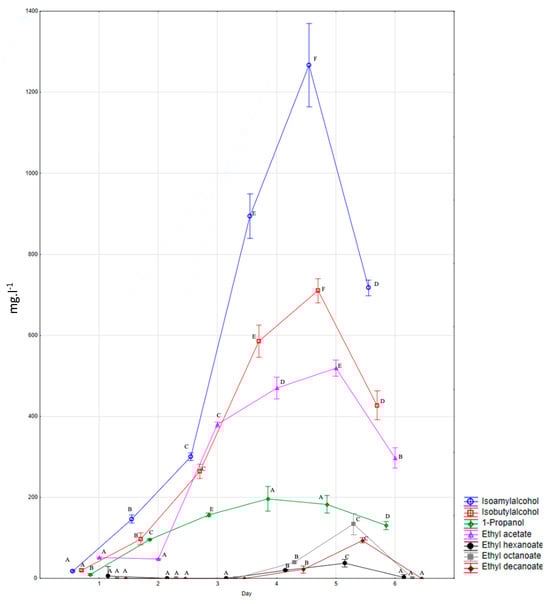 - Morakul, S.; Mouret, J.R.; Nicolle, P.; Aguera, E.; Sablayrolles, J.M.; Athès, V. A Dynamic Analysis of Higher Alcohol and Ester Release During Winemaking Fermentations. Food Bioprocess Technol. 2013, 6, 818–827. [Google Scholar] [CrossRef]