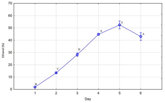 3.1.2. Evolution of Ethanol Content during Fermentation