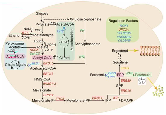 Schematic diagram of combining metabolic engineering to increase the production of patchoulol in S. cerevisiae. The red fonts indicate enhanced genes; the green fonts indicate the introduced foreign gene; the blue fonts indicate the knocked-out gene; and the yellow fonts indicate the weakened gene. Dashed arrows indicate multi-step reactions. ADH2, alcohol dehydrogenase; ACS2, acetyl-CoA synthetase; ERG10, acetoacetyl-CoA thiolase; ERG13, hydroxymethylglutaryl-CoA synthase; tHMG1, catalytic domain of hydroxymethylglutaryl-CoA reductase; ERG12, mevalonate kinase; ERG8, phosphomevalonate kinase; ERG19, mevalonate pyrophosphate decarboxylase; IDI1, isopentenyl diphosphate isomerase; ERG20, farnesyl pyrophosphate synthase; PK, phosphotransferase; PTA, phosphotransacetylase; SeACS, acetyl-CoA synthetase from Salmonella enterica; PTS, patchoulol synthase; CIT2, citrate synthase; MLS1, malate synthase; DPP1, diacylglycerol Pyrophosphate Phosphatase; LPP1, lipid phosphate phosphatase; and ERG9, squalene synthase.