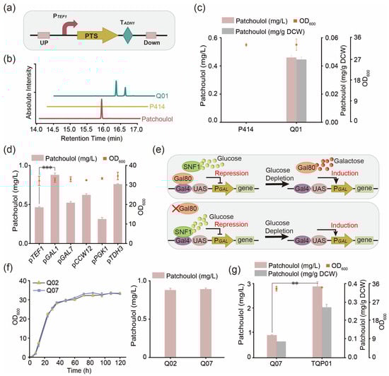 S. cerevisiae possesses a mevalonate pathway utilizing the intermediate metabolite acetyl-CoA as the precursor, which can synthesize the direct precursor FPP of patchoulol, and is a promising microorganism for the synthesis of patchoulol []. However, due to the lack of the essential gene for patchoulol synthesis in S. cerevisiae, external introduction of patchoulol synthase is necessary to enable patchoulol production []. In this study, patchoulol synthase (PTS) from Pogostemon cablin was selected for codon optimization and gene synthesis. PTS was heterologously expressed in the P414 strain using a strong promoter TEF1 (Figure 2a), resulting in the generation of the initial strain Q01. Following fermentation for 120 h, GC-MS analysis detected 0.46 ± 0.01 mg/L (0.04 ± 0.001 mg/g DCW) of patchoulol in the recombinant strain Q01, while no patchoulol was detected in the control strain (Figure 2b,c), indicating successful construction of a patchoulol synthesis pathway in strain Q01.