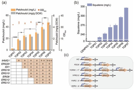 Strengthen the MVA pathway in S. cerevisiae. (a) Effects of overexpression of mevalonate pathway genes on the yield and cell growth of patchoulol; (b) Effects of overexpression of mevalonate pathway genes on squalene in S. cerevisiae; (c) Construction of gene expression frame of the mevalonate pathway. Data presented as mean values ± SD from three independent biological replicates (n = 3). Statistical evaluation (p-value) compared to the control was conducted by a two-tailed t-test. * p < 0.05, ** p < 0.01, *** p < 0.001 (p ≥ 0.05).