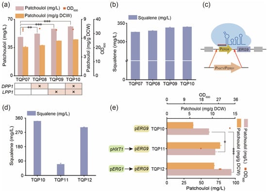 FPP plays a crucial role in the isoprene pathway as an intermediate, serving as a precursor for various metabolites. The farnesol pathway and squalene pathway, which use FPP as a precursor, compete with the patchoulol synthesis pathway for FPP and affect patchoulol synthesis [,]. Inhibiting the competition pathway of FPP is an important strategy to enhance patchoulol production. Previous research has indicated that the transformation of FPP to farnesol is primarily regulated by DPP1 and LPP1 genes, with their absence leading to increased sesquiterpene yields []. By sequentially knocking out DPP1 and LPP1 genes in the TQP07 strain, new strains TQP08, TQP09 and TQP10 were constructed. Experimental results (Figure 4a,b) showed that knocking out DPP1 and LPP1 genes boosted patchoulol production, with TQP10 achieving a yield of 60.94 ± 0.46 mg/L (5.77 ± 0.03 mg/g DCW), a 26% improvement over TQP07. However, the impact of the knockout of the farnesol pathway was not significant, especially in the strain with the DPP1 knockout alone. This is similar to the results obtained by Liu et al. [] This is likely due to the proteins regulated by the DPP1 and LPP1 genes being small molecular weight integrated membrane proteins located on the Golgi apparatus and vacuole membranes, while the synthesis of patchoulol is mainly in the cytoplasm. There is a limited conversion of FPP to farnesol in the cytoplasm via DPP1 and LPP1, with more FPP flowing to other substances such as squalene, heme A and ubiquinone []. Therefore, reducing the metabolic flux of farnesol is limited to increasing the production of zebra mussels.