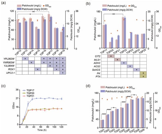 Modifying transcription regulatory factors in chassis cells has been shown to increase the yield of terpenoids in S. cerevisiae []. This study explored common transcriptional regulatory factors to increase the production of patchoulol. Knocking out ROX1, a transcriptional suppressor of hypoxic genes, was found to boost the transcription and translation of MVA pathway genes, thereby intensifying the mevalonate pathway []. Deficiency in YPL062W, YJL064W and YNR063W (transcription regulatory factors, their genetic functions and molecular mechanisms are currently unclear) yeast strains was observed to alter the carbon flow of acetyl-CoA, enhance glucose utilization, and improve energy metabolism [,,]. The mutant gene UPC2-1, derived from UPC2, was found to enhance the absorption of exogenous sterols in cells under aerobic conditions and elevate the expression level of the sterol metabolic pathway []. In this study, YPL062W, YNR063W, YJL064W and ROX1 genes were individually or jointly knocked out in TQP12 strain, and the UPC2-1 gene was overexpressed, resulting in the creation of engineered strains TQP13, TQP14, TQP15, TQP16, TQP17, TQP18 and TQP19. The production of patchoulol in these strains was measured as 98.13 ± 2.57 mg/L, 96.42 ± 2.92 mg/L, 69.03 ± 1.31 mg/L, 103.34 ± 1.54 mg/L, 110.14 ± 3.05 mg/L, 65.83 ± 2.03 mg/L and 53.40 ± 3.77 mg/L, respectively (Figure 5a). The results indicated that knocking out YPL062W, YNR063W and YJL064W individually showed some increase in patchoulol accumulation, the combined deletion of these three genes significantly boosted patchoulol yield, suggesting a synergistic effect of these gene deletions on patchoulol accumulation.