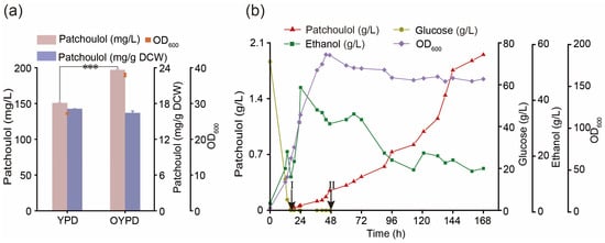 The study utilized a two-stage fed-batch fermentation process with optimized conditions using 10% dodecane for the extraction of patchoulol (Figure 6b). In the first stage, the engineered strain consumed nutrients in the culture medium for 18 h until glucose depletion, followed by the addition of feed medium I to promote rapid cell growth. Glucose concentration was carefully controlled below 1.0 g/L by adjusting the flow rate of feed medium I. Ethanol is commonly used as a carbon source in terpenoid-producing S. cerevisiae during fed-batch fermentation and greatly increases terpenoid yields compared to glucose [,]. In the second stage, after 48 h, strain TQ08 biomass remained stable with an OD600 of 185.31 and ethanol content of 31.0 g/L. Subsequently, feed medium I was replaced with feed medium II to supplement the carbon source, with the ethanol flow rate adjusted to maintain a concentration of about 20 g/L. As shown in Figure 6b, the patchoulol yield gradually increased throughout the fermentation process. In the first stage, the cell concentration of the strain increased sharply, but the patchoulol yield increased slowly, reaching only 246.42 mg/L at 48 h. In the second stage, the strain stopped growing and the flow-added carbon source was shifted from glucose to ethanol to promote the synthesis of patchoulol, which was observed to increase significantly, reaching 1.95 g/L at 168 h.