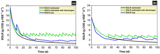 However, in continuous systems, the SOLR is not a fixed value since biomass is constantly produced and accumulated inside the reactor. Therefore, SOLR at a given time “n”, , could be estimated according to Equation (2), in which (g VSS L−1) is the amount of biomass inside the reactor at given time “n”.