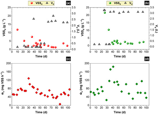 Biomass exiting from reactors: (a,b) VSS concentration of discharges (VSSd) and volume of each discharge (Vd), and (c,d) VSS mass flow .