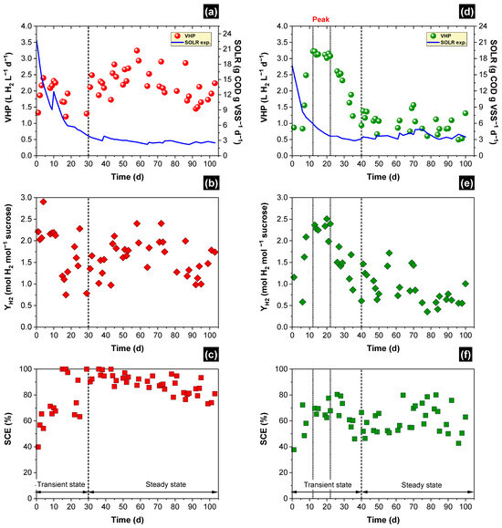Hydrogen production and sucrose conversion in the packed-bed and structured-bed reactors: (a,d) volumetric hydrogen production (VHP) and specific organic load rate (SOLR), (b,e) hydrogen yield (YH2), and (c,f) sucrose conversion efficiency (SCE).