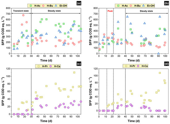 Soluble fermentation products (SFP) detected in the packed-bed and structured-bed reactors during transient and steady-state periods: (a,b) primary SFP and (c,d) secondary SFP.