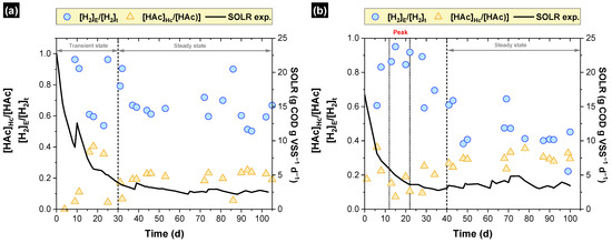 The SOLR is defined as the amount of the substrate available per amount of biomass in the reactor per time (g COD g−1 VSS d−1) such as represented by Equation (1), in which (g substrate L−1 d−1) is the organic loading rate and (g VSS L−1) is the concentration of biomass inside the reactor.