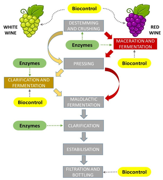 Schematic showing the use of biocontrol agents and enzymes in the main steps of wine production.
