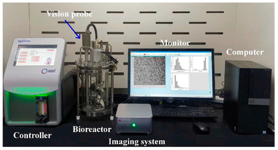 As depicted in Figure 2, CHO cells have been cultured inside a bioreactor along with a vision probe. The monitor displays the collected images together with the image analysis result. The in situ microscope, equipped with an imaging system and connected to a computer, captures cell images in real-time during the cell culture process. These images are then subjected to deep learning-based image analysis using the Mask R-CNN algorithm, allowing for the accurate segmentation and analysis of the cells. The deep learning method, trained by 183,040 labeled cells of 184 images, effectively-recognized cells within clusters. This approach outperforms traditional methods in terms of common image-based evaluation methods. The researchers analyzed the temporal variations in cell dimensions and shapes, indicating that the majority of cells are approximately spherical, with their average diameter increasing throughout the culture process [24].