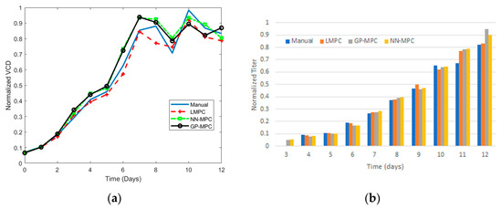 Figure 3. Trajectories for GPR-MPC, NN-MPC, linear-MPC, and manually controlled culture predictions for (a) viable cell density and (b) protein titer [60]. Reprinted with permission from John Wiley and Sons.